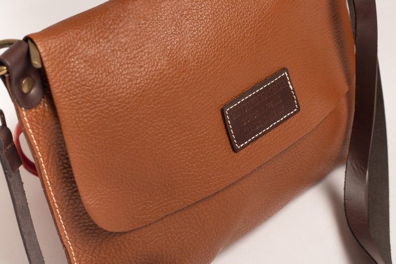 Sac à bandoulière en cuir de couleur camel, avec détail logo, bandoulière réglable et amovible. Fermeture éclair et rabat.